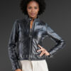 The black jacket crafted from Italian-finish leather is a classic piece of art for women’s bike lovers. It has a trendy and smart-looking Mandarin collar with a snap button. The jacket has a metallic zipper closure that opens the outfit symmetrically. The collar protects the neck from chilled winds during strolling or biking in the open air.