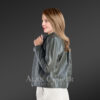 The jacket is in a cropped style and extends to the waistline. The high-quality metal zipper as front closure is simple and straight. This jacket has a mandarin-style collar with a snap button that gives a smart look. Both the zipper and the collar add a simple touch of sophistication. The metallic zipper adds some edge and flair to it.