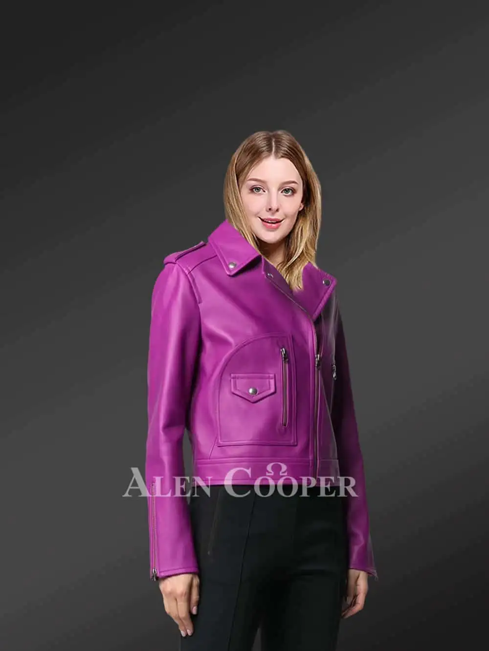 The jacket is made from authentic pelts of the premium range Italian-finish leather. It reflects rich Genuine leather jackets in purple that is undeniably feminine and gives out a powerful magnetic effect to make you the center of attraction in any crowd. High quality leather has rich shiny texture and is luxuriously soft as well as lightweight. The Genuine leather jackets in purple has full length sleeves decked with stylish zippers at the cuffs. Designed with great care and caution the jacket has distinct collar and lapel that are decked with front design snap buttons. By virtue of straight point collars the jacket has a simple neckline as in ordinary shirts. Furthermore it has smart shoulder straps. High quality zippers are installed to keep you warm and cozy in outdoors during severe cold weather. The zippers are placed little on the left. There is a slanting, zippered, stylish and spacious hand-warming side pocket on the left while on the right it has a straight zippered pocket. In addition to that there is also a tiny pocket on the right with conventional button closure. The appealing purple leather jacket radiates a unique feminine charm that is simply impossible to resist. The jacket has straight hemline. Moreover it has immaculate inner lining made of pure silk. Fit to size is guaranteed for everyone without caring for your height or figure. Designed with towering heights of care and precision the chic leather jacket for women comes with absolutely flawless finishing. You can wear the innovatively designed warm clothing item as a proper dress. This is indeed your most assured alternative to appear smarter, classier, hotter, sultrier, more dignified, appealing, stylish, tasteful and elegant.