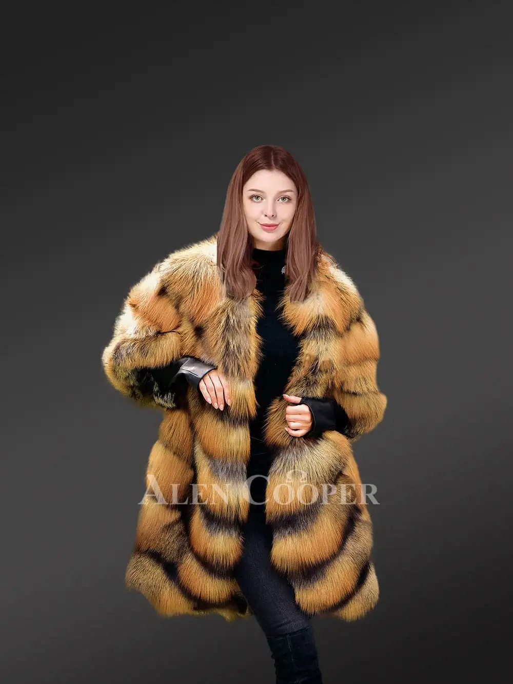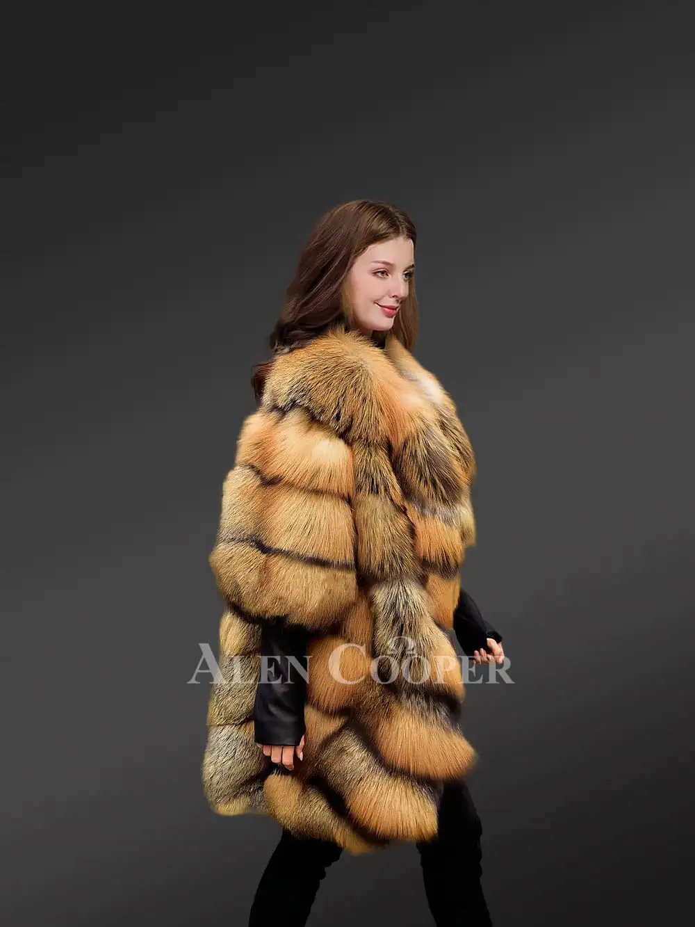 Swing coats tend to garner a lot of eyes as stylish winter wear. Alen Cooper has launched its swing coat made from authentic full-skin golden fox fur pelts. Having a fantastic color and quality, this Golden Fox Fur Coat is one of the most expensive and rare furs in the market. The V-shape Golden Fox Fur Coat has got a slanting pattern, both front, and back. The slant v-shape coat is plush winter wear that is dictated with golden, black, and white fur detailing.Â