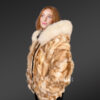 This luxurious golden fox fur womens bomber jacket never fails to create sensation because of its magnificent aesthetic features. It looks radiant with the natural colors of golden fox fur. At the same time, it envelops one from the cold wind while offering a velvety feel to the skin. With a large hood outlined by trims of fur, one receives complete protection in the winter after wearing this elegant outfit.