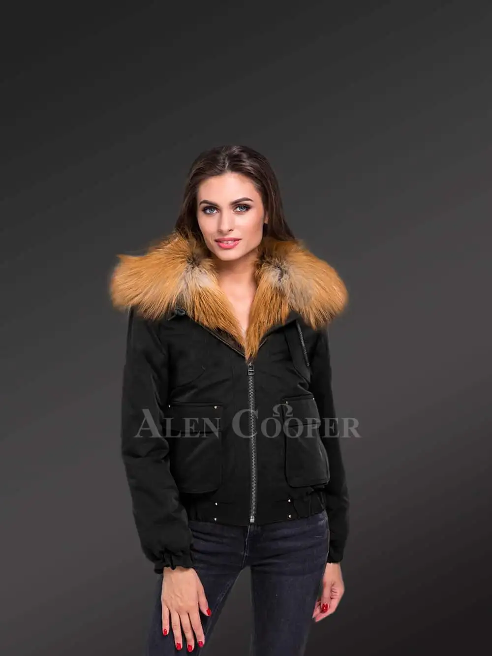 Blending style with day to day functionality, a unique version of Golden island fox fur hybrid black bomber jacket convertibles for women has arrives in the market. The product range is gorgeous as every effort has been taken to make you look more divine, more aristocratic and sexier in it. The rich patch of fur along the trim of the hood and the frontline invariably makes you the centre of attraction in any crowd.