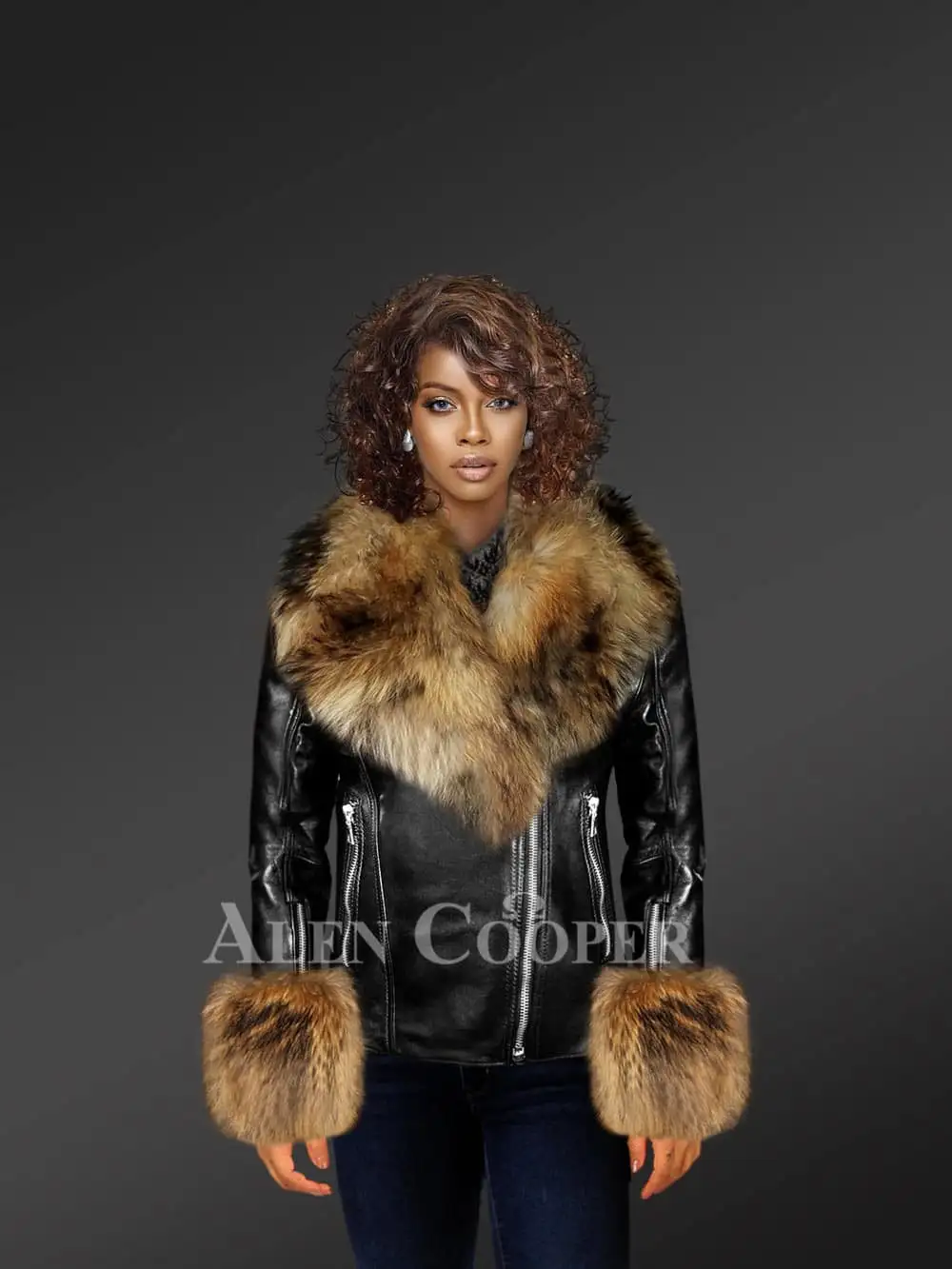 This Women’s Jacket is made of Genuine Leather is an upscale trending fashion statement that can we worn with a pair of jeans or trousers. Its enhanced design with detachable Fox Fur Cuffs adds an extra style and dignity to the outfit and personality. Its Jet Black Hue not only makes you look sophisticated but also make you stand out in the crowd. In severe winter days wearing the Hood, Lapels and Cuffs of fur will give the extra warmth you need and in less cold days you can remove the fur Collar & Fur Cuffs and only wear as a regular leather jacket. Designed with long sleeves, it has two zips in the cuffs, two zipped side pockets and an asymmetrical zipper as closure. This waist length attire has premium quality satin lining is fully lined for comfort of the wearer. If taken proper care a Leather Jacket can be a lifetime achievement. It can be used for generations.
