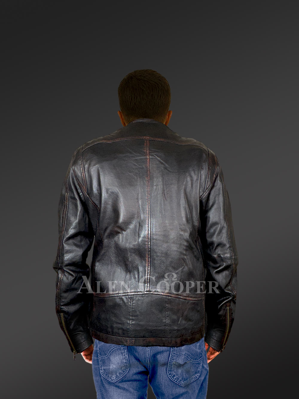 This luxuriant leather moto jacket with band collar will be perfect for outings or to turn the heads at winter-time fests, events or parties. It brings the softness and elegance of premium lambskin leather. Therefore, it offers a comforting feel to the wearer alongside making one look debonair.