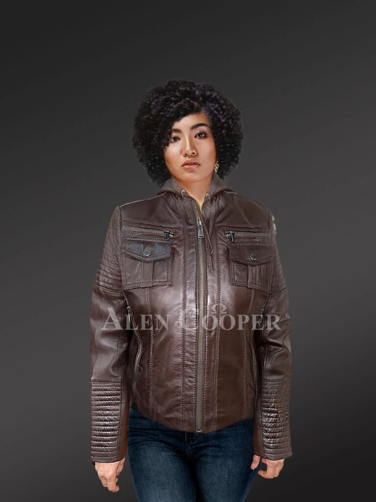 The Hooded Motorcycle Leather Jacket for women is one of Alen Cooper’s timeless winter clothing designs. It is one of those wears that will survive both on chilly winter nights and on sunny winter days attributable to its adaptability. The design and structure are perfect for all women of all body types. The product’s design is reminiscent of a motorcycle jacket.