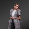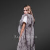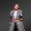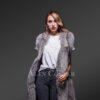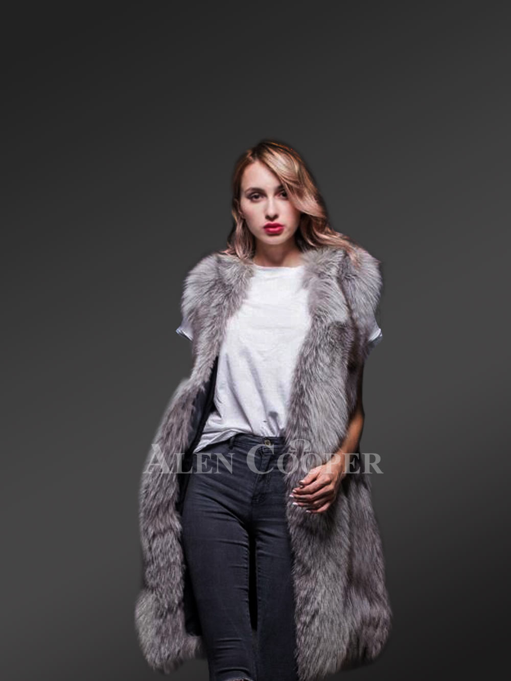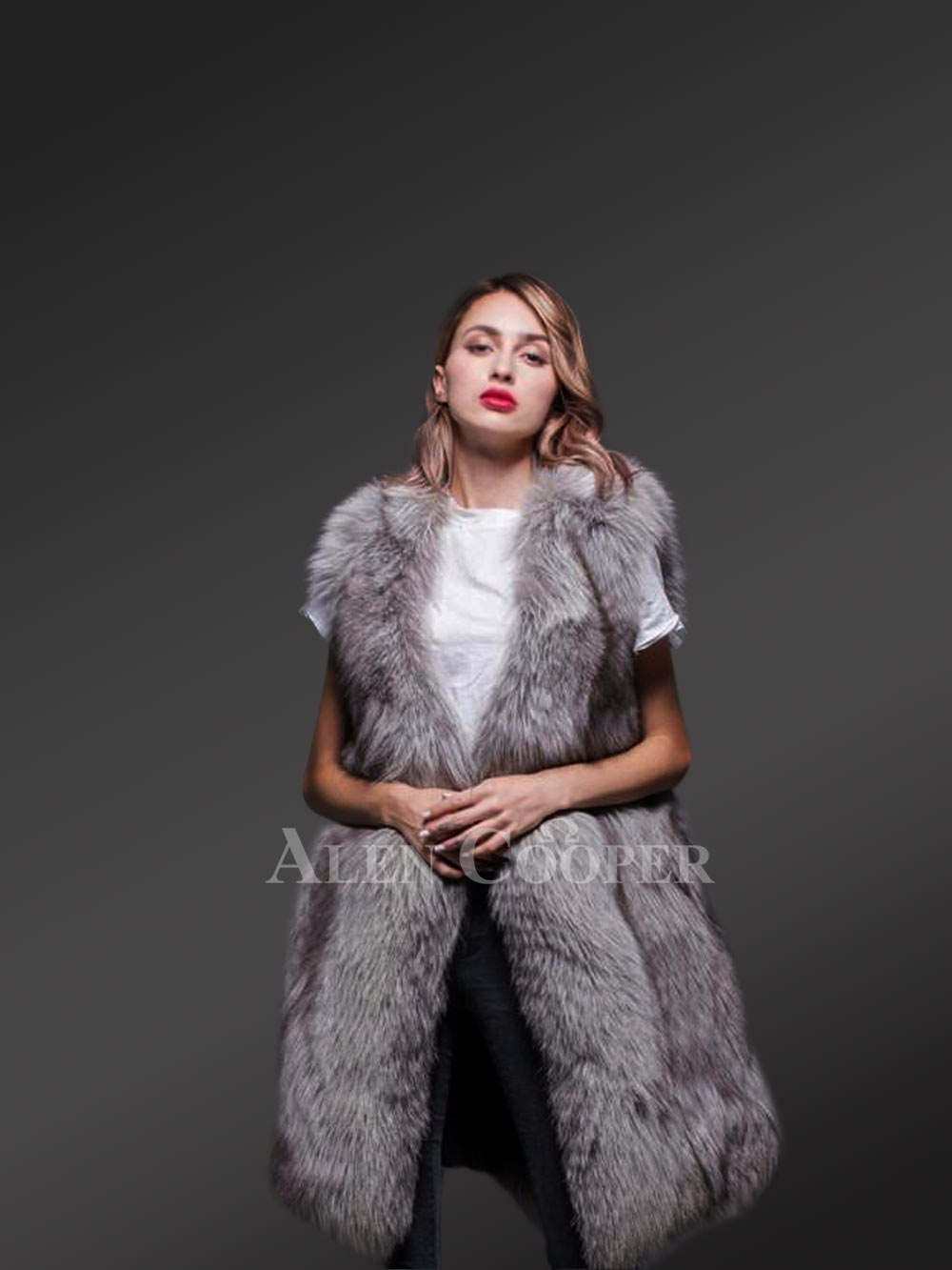 Make your winter evenings stylishly balmy in this long and sleeveless fox fur coat as a pleasant thermal couture. Although it carries a casual lightweight feel it adequately safeguards the wearer from frigid times. The insulating quality of real fox fur pelts keeps one well-guarded from harsh to mild coldness. The butter-soft texture of real fox fur assures snugness combined with a toasty feel throughout the wear. Alen Cooper presents this sleeveless coat in a classy grey shade that readily matches the party ambiance or a social mood with perfect élan.