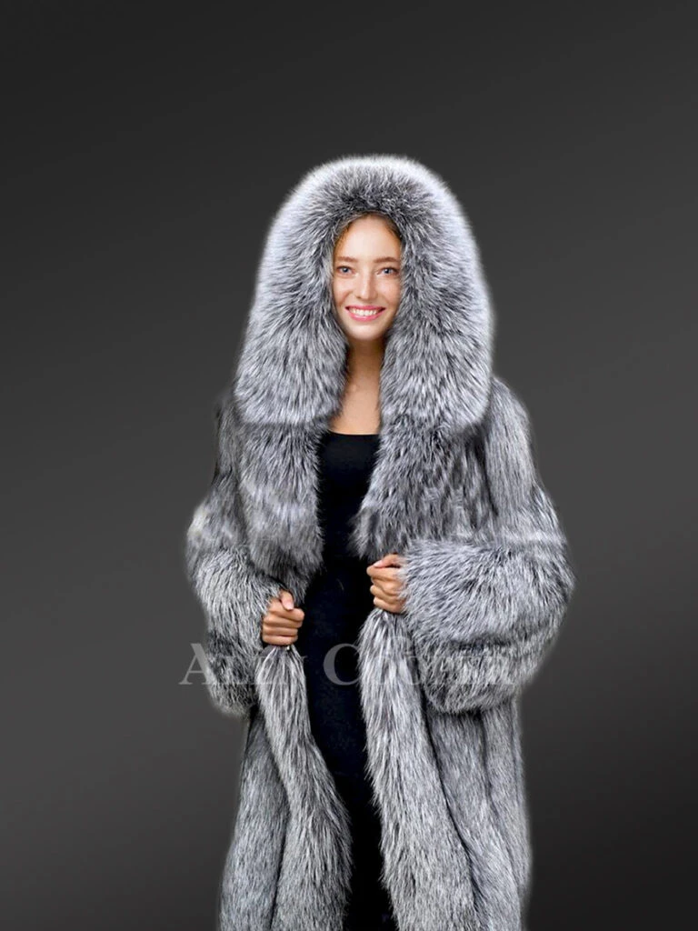 The utilitarian features of this long coat are as magnificent as its aesthetic features. Owing to the full skin pelts of Silver fox, this knee-length coat is ideal for frosty weather. It keeps a large part of the body wrapped in the comfort of fox fur. The long sleeves as well as the hood of fox fur certainly add to this pleasure.