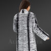 This stylish, furred piece majestically fends off the frigidity of winter weather courtesy of its warm, authentic Rex Rabbit pelts. This classy knee-length coat as a sustainable winter fashion captivates the view at any event or party. The stunning striped pattern in black and grey shades creates a sublime visual impact on the onlookers. The premium fur quality and the distinctive motif effortlessly magnify its pristine charm. In addition, the intrinsic satin lining comforts the wearer as an added layer of soothing fabric. Women can wear this lightweight apparel even during daytime events without any uneasiness.