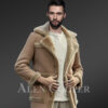 Overview: This modish long shearling coat for men looks suave in a beige shade and suede finish. The shearling wool accessorization across the chest and waist undoubtedly glamorizes its looks. Also, there are wool trims along the frontline and around its bottom border. These features add to the elegant looks of this winter wear.