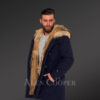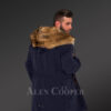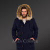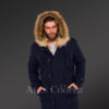 Masculine and Stylish Golden Island Fox Fur Hybrid Navy Parkas for Men with Rabbit Liner