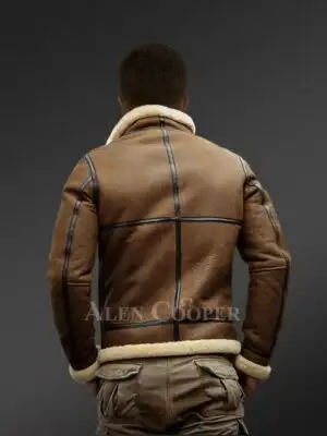 Tan Brown Shearling Bomber Jacket for Men with Leather Lining