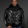 - Leather V bomber luxurious puffer jacket for men with authentic goosed down paddingÂ