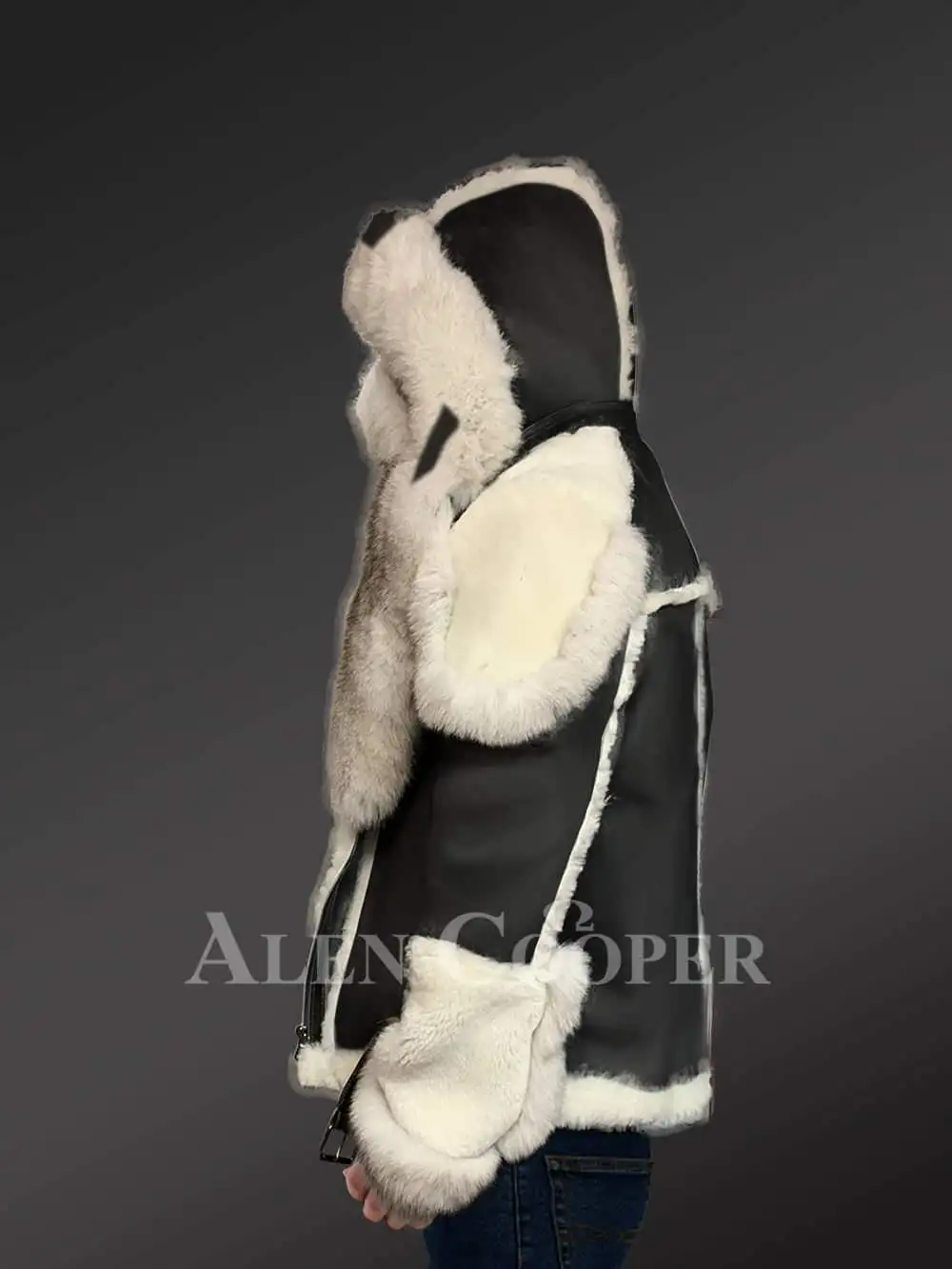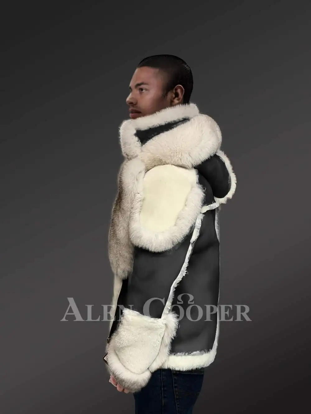 The sophisticated outerwear is highly breathable owing to the fine detailing of soft and dense fur. Additionally, white sheepskin wool patches around the shoulder, sleeve, zipper, and hemlines majorly add to the charm and comfort. Also, the dual-tone off-white fox fur around the collar and zip-out hood is something you cannot give miss.