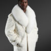 It radiates a monochromic white tone therein upgrading its elegance a notch higher. It flaunts an oversized body with elongated sleeves. There is a band around both the cuffs with buttons attached to it. Similarly, two strappy bands can be seen on both the shoulders. There is a chunky belt with buttons designed around the waist at the backside of the coat. This men’s coat features a short-length size therein allowing easy movement for the wearer. Furthermore, it showcases a thick and wide fashionable lapel style crafted from real fox fur. This broad furry white collar safeguards the neck and the shoulders against chilly weather.