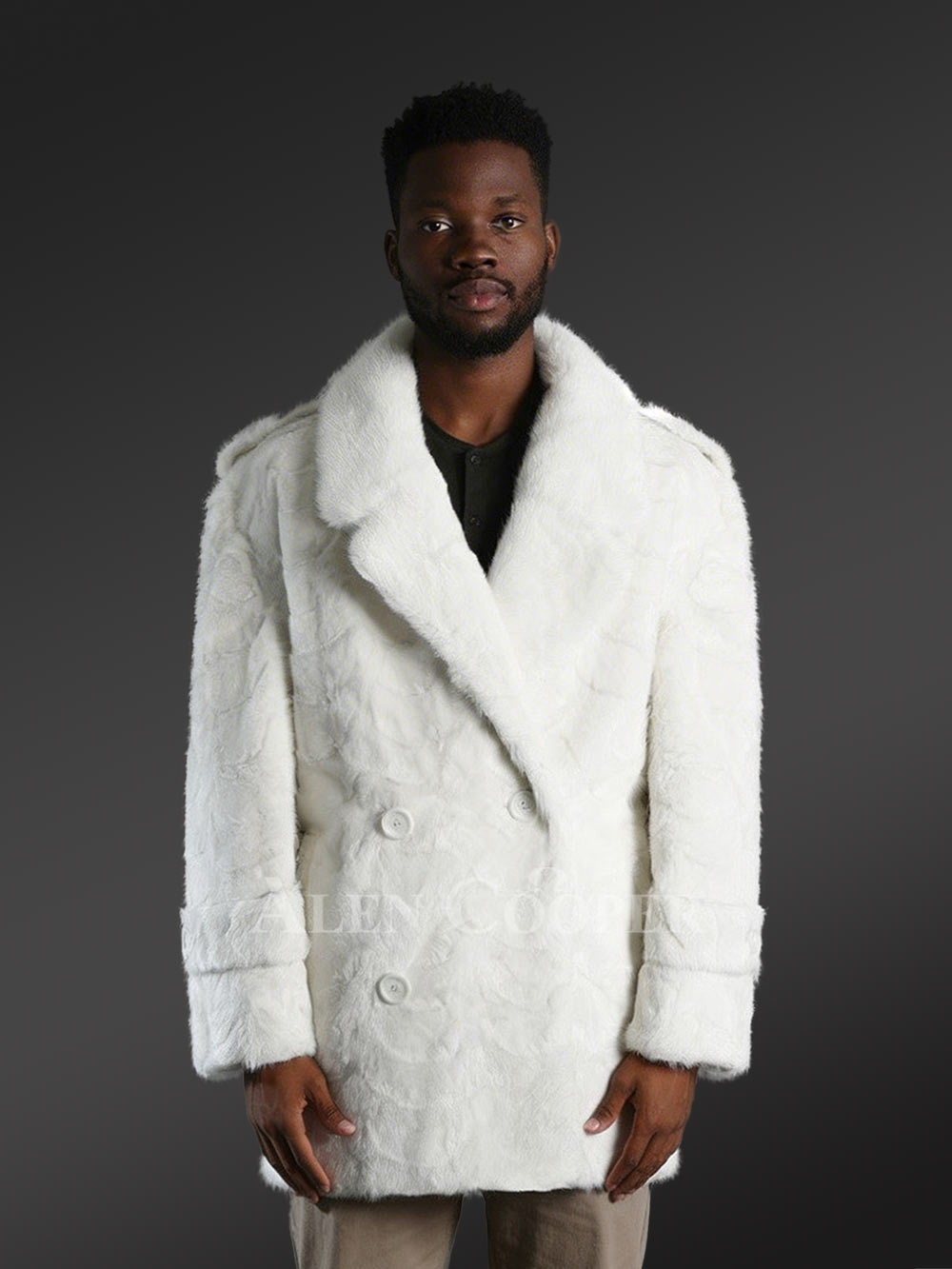 A buttoned wide band of mink fur also highlights the backside of the coat in the middle looking like a modish belt. The satin lining offers a pleasant feel to the wearer along with the mink fur which feels incredibly soft to the touch. The breathable natural fur also offers a feeling of freshness and the coat never feels too hot to wear. This lightweight outfit is equally comforting to wear during outdoor activities whether it’s an outing, a long trip or outdoor party. This white pea-coat can be beautifully paired with the lighter or brighter shades of any color on the palette. Thus, the styling options are limitless for this coat. One may pair it with a large variety of bottom-wear and top-wear for men.