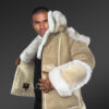 This elegantly plush mens shearling jacket with fox fur accents embellishes winter times with its classy charm. It resembles the B3 bomber jacket, designed with stylish and refined features for immaculate, luxurious winter wear. Handcrafted from premium shearling pelts, this opulent garb brings in the comforting warmth of a furred interior and the aesthetics of a suede exterior. This B3 bomber-style jacket mesmerizes the view with its classic yet cosmopolitan look for any social event or a casual trip.