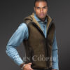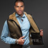 Made with care, caution and precision, the shearling vest showcases unparalleled style and elegance. Not just that, the vest comes with a hood area with that dual rub off finish on the body. The inside of the hood as well as the collar area is well decored with the sheepskin woollen layer. The inner woollen layer of the sheepskin is flipped and exposed to those areas.