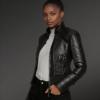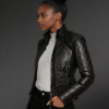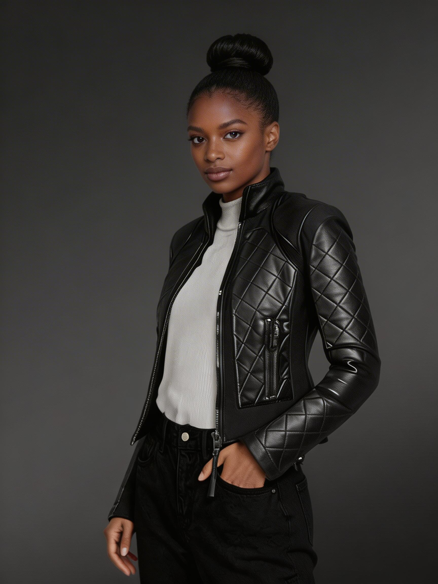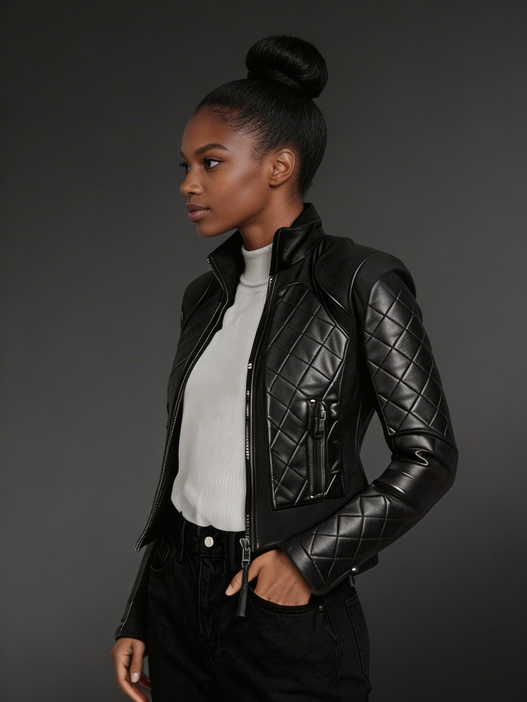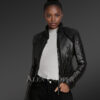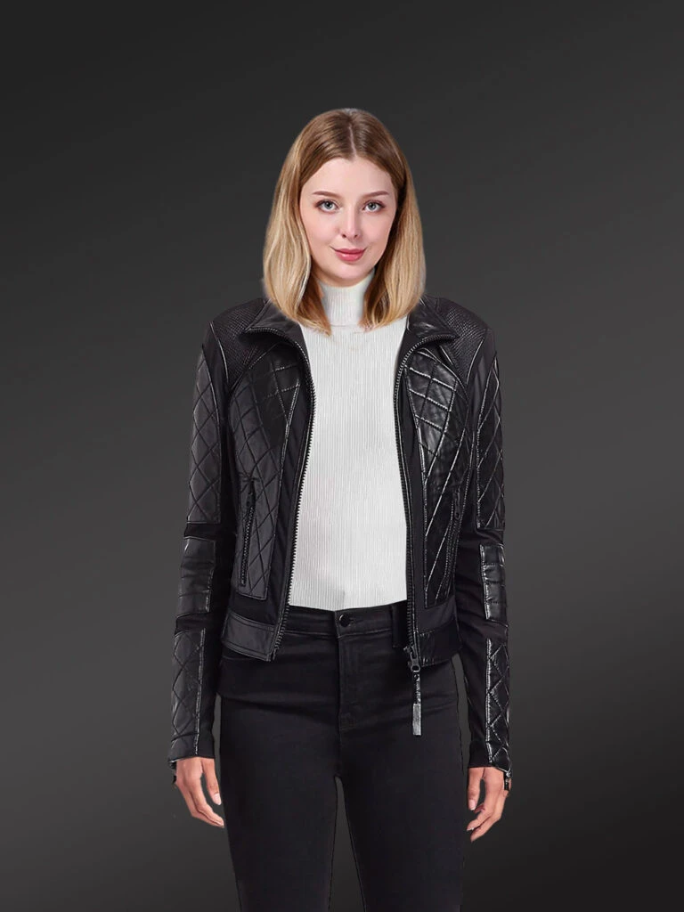 Women’s Black Moto Leather Jacket with Diamond Pattern