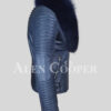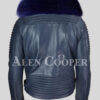 - Navy blue luxury biker jacket of premium lambskin leather feature a detachable shawl-style lapel of fox fur