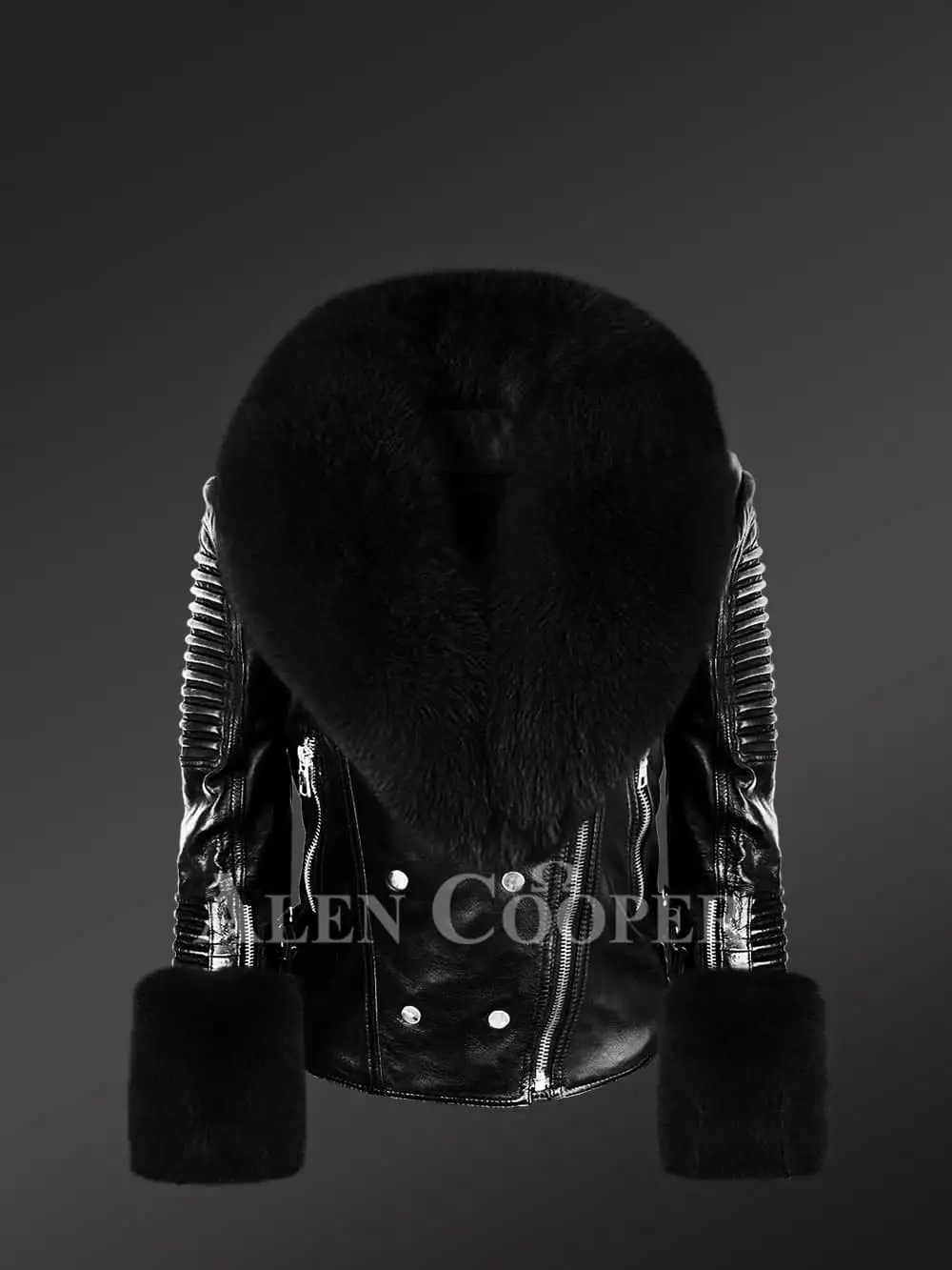 Leather Biker Jacket with Fox Fur Collar and Cuffs for Women