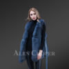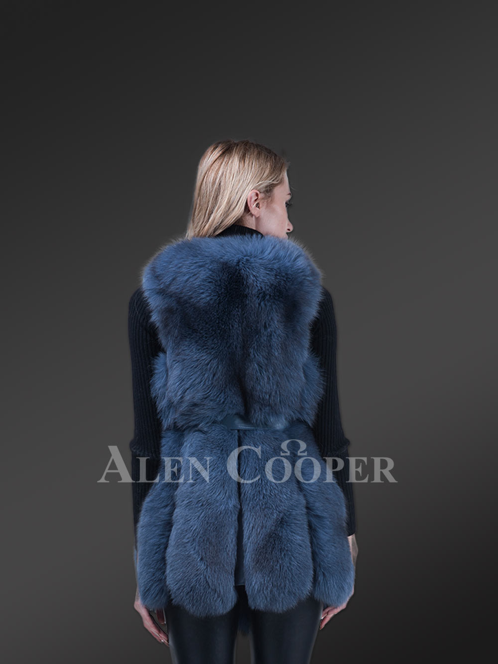Parallel fox fur pelts are co-joined in crafting this real fox fur womens vest with majestic appeal. Excellent tailoring being a functional feature of this outfit immaculately shines through its fashion avatar. The premium quality of fox fur pelts produces a fluffy form accompanied by a soft and smooth texture. A blue colored leather belt at the waistline snugly embellishes this plush wear as a key feature. The alluring pockets on either side help the wearer keep her palms in spacious warmth. It also features a hidden closure therein offering insulating comfort during cold weather conditions.