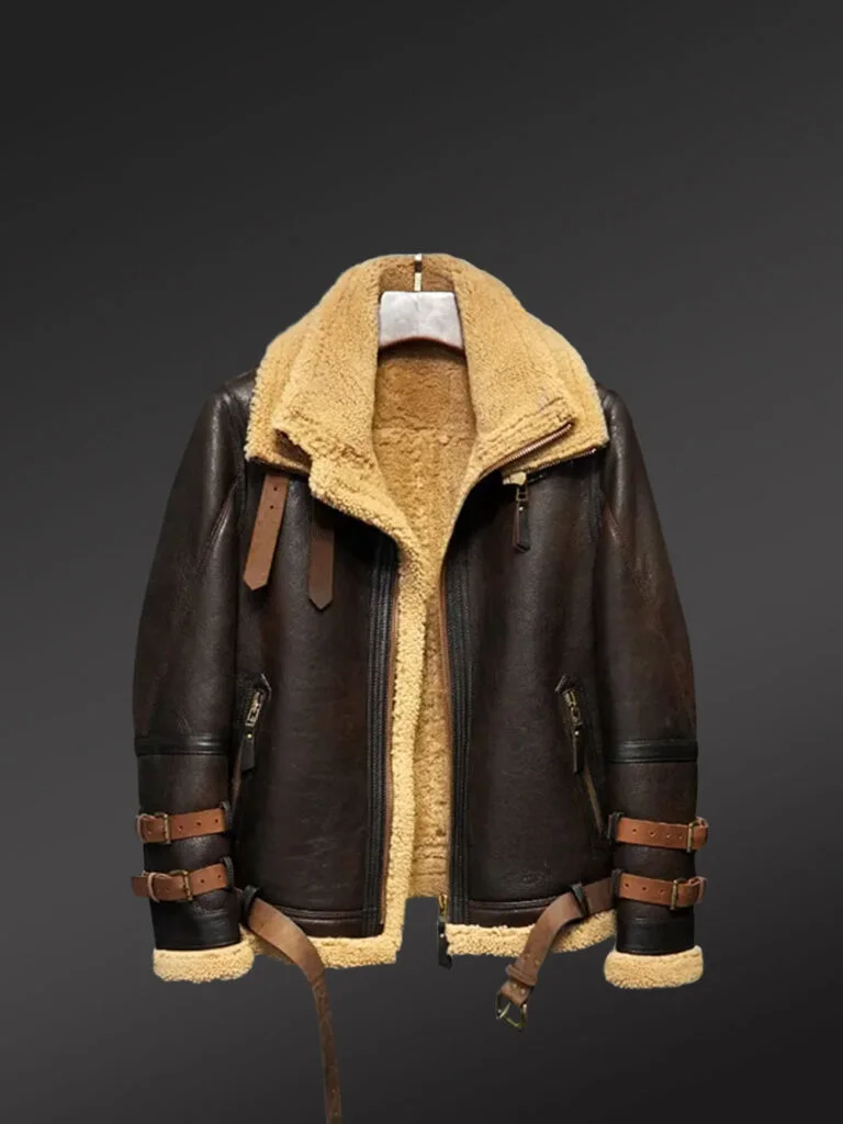 To point out more, Striking a powerful contrast, the Real Shearling Jacket Men features contrasting cognac-colored belts on the body. For instance, it has a leather belt with dual straps on the collar. Hence, the inbuilt leather belt along the waistline enhances the color of the jacket. Then again, the addition of the leather belt around the lower arm adds more style and sophistication.