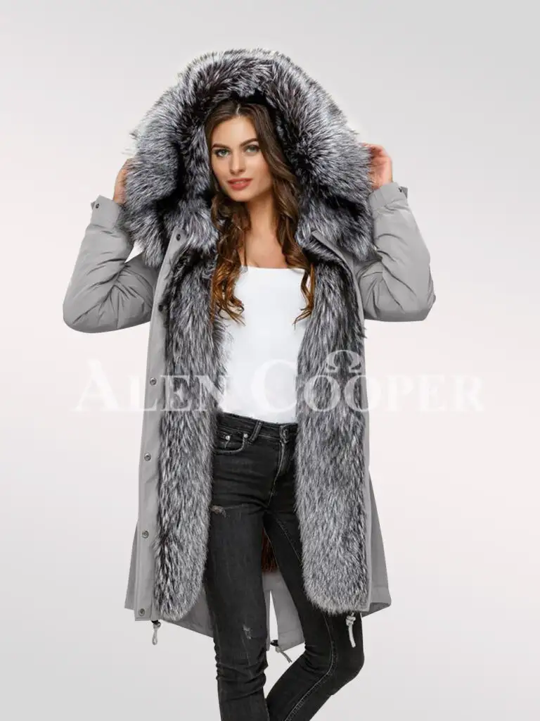Scintillating Scandinavian Silver Fox Fur Hybrid Grey Parka Convertibles with Rabbit Liner for Today’s Women