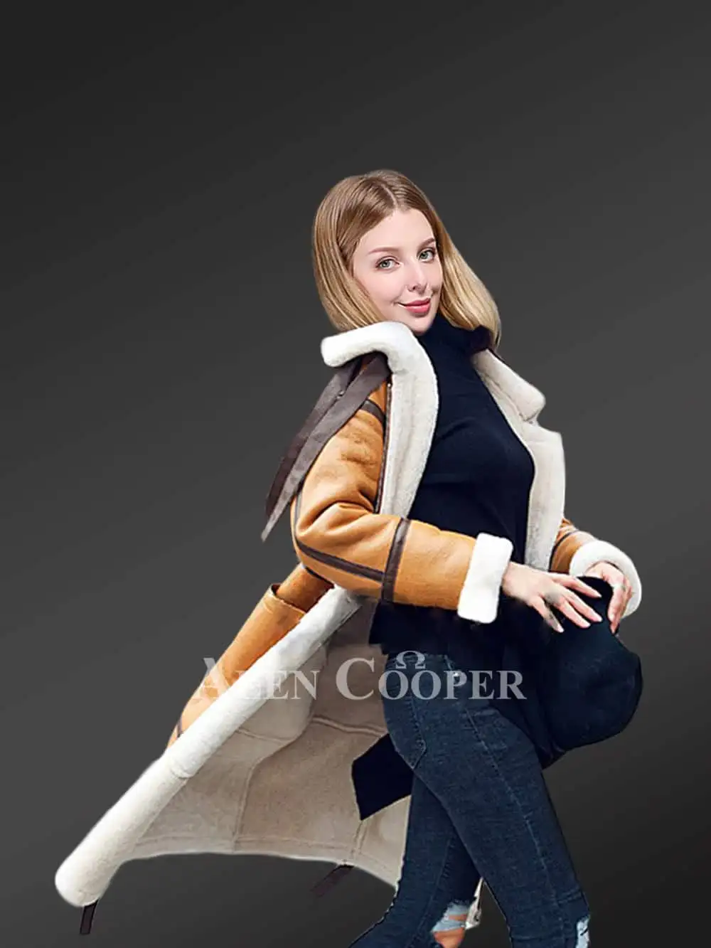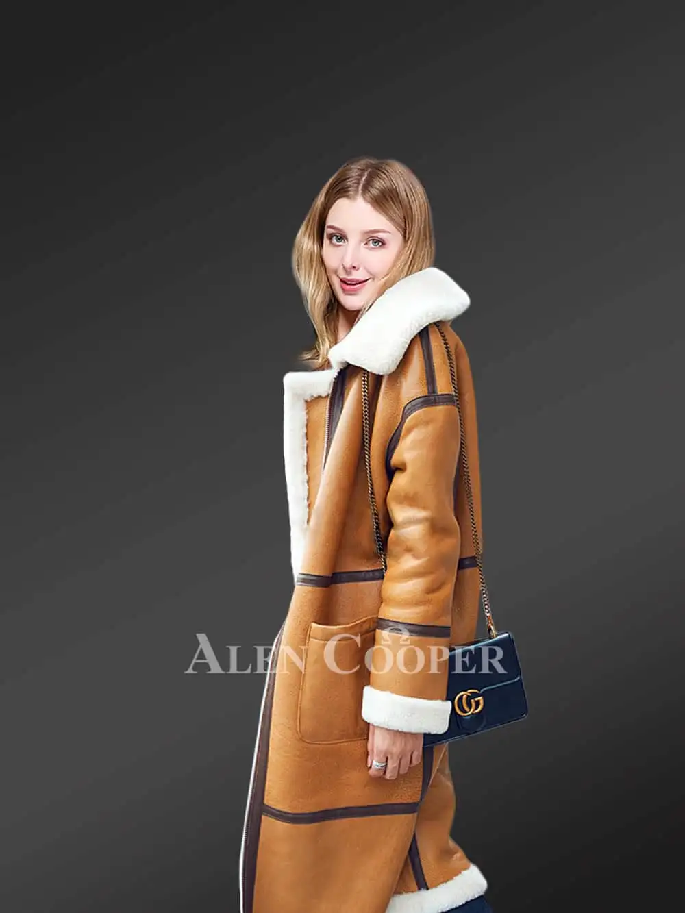 The jacket has spacious, stylish, hand-warming side pockets to keep your palms warm and comfortable outdoors during severely cold weather. There is a stylish, inbuilt belt along the neckline. The inner woolen layer of the fabric is flipped and exposed outward to define the collar, frontline, bottom edge and the handcuffs at the wrists. This design concept creates a powerful contrast and the long lambskin overcoat appears classier and more appealing.
