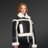 This luxurious shearling womens crop coat can make a woman look like a diva at any wintertime event. The use of shearling wool makes this outfit suitable for the winter. Additionally, this outerwear looks magnificent with ornamentation of white woolen trims on black hued Nappa finished lambskin.