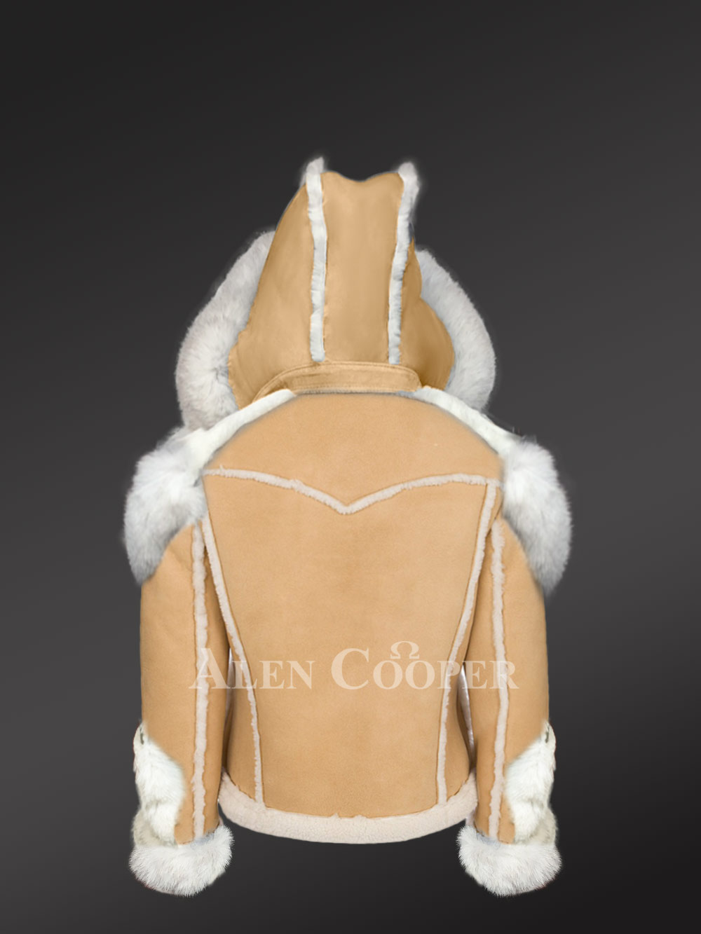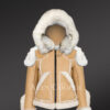 The Sheepskin Shearling Jacket for women is made from authentic pelts of shearling or lambskin. The jacket is soft and supple in texture. It also offers sufficient warmth and insulation even in extreme low weather conditions. The jacket is in suede finish and beige in color. The highlighted part of the jacket is that the overall winter wear is embellished with white fur detailing.