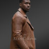 To emphasize, the long sleeves carry piping structure and further entails a zip closure along both cuffs thereupon creating a sophisticated appearance. On the other hand, the wrist borders show alteration to add to innate characteristics. The double breast pattern is given an intricate touch by dual-column front buttons. Snap button closure, then again, is pretty magnificent. An additional zip-up closure in diagonal orientation extends all the way to the lapel. The slim fit leather jacket ‘s appearance is intensified by the asymmetrical layout of smooth-run zippers.