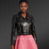 The Metallic Crop Stud Leather Women Jacket in black is one of Alen Cooper’s imperial styles in the winter wear category. It is one such attire which is both weather and utility flexible. The overall structure is best suited for all women of all physiques and rather enhances the feminine appeal. The product reflects the biker jacket style.