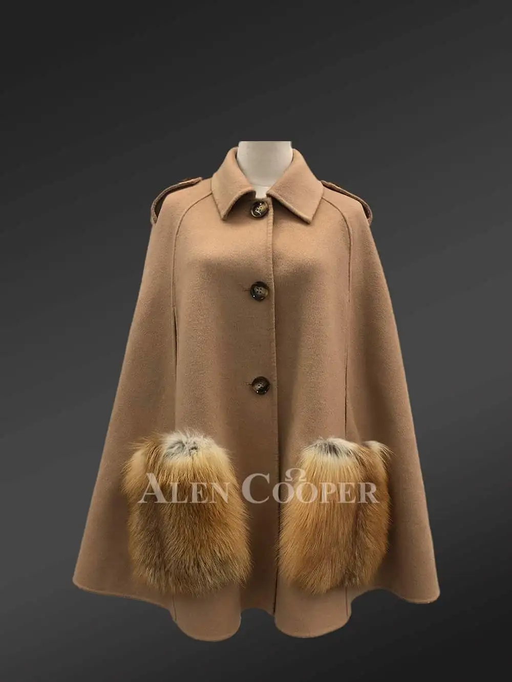 The beige hued classic Women Red Fox Fur Poncho exudes a trendy air in light of its shoulder epaulets, button-closing attributes, and sophisticated collar down. Its impeccable pattern-making and design ooze artistic endeavors. The plain attire adorned with fewer details grants the most prudent pick by enabling its enduring trend in transitional fashion.