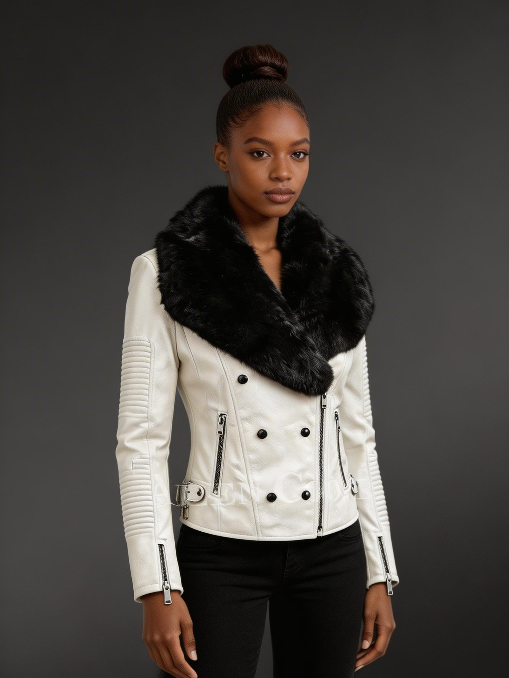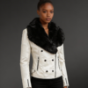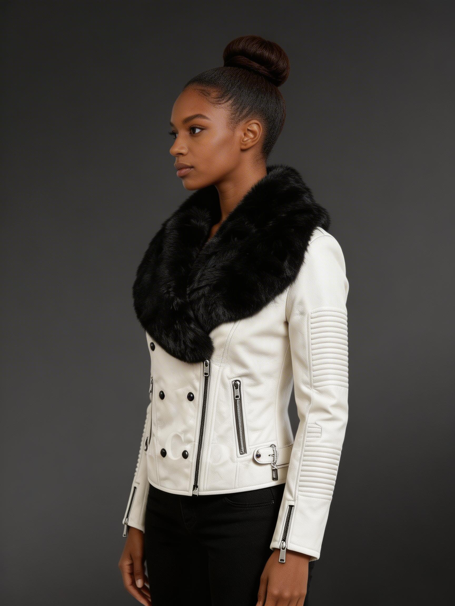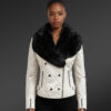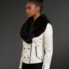 This posh biker jacket is designed with a detachable collar of fox fur. This isn’t just a glamorizing feature. To emphasize, the shawl-style lapel covers the neck, shoulders and chest in warmth of fox fur. Furthermore, the furry lapel dyed in black looks striking in contrast to the pristine white leather.