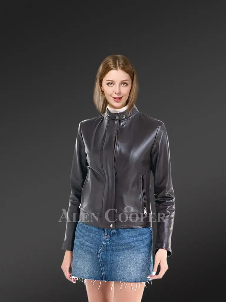 This chic womens black lambskin leather jacket looks fascinating with a slim-fit body and sleeves with zippered cuffs. The buttery texture of leather certainly offers a pleasant experience to the wearer.Designers have handcrafted this short jacket with attention to the quality of every feature as well as to the outfit’s longevity. It has a metal zip fastener along with a buttoned band collar. Therefore, one can enjoy maximum protection and warmth in colder months. One can safely carry their essentials inzippered side pockets which are equally useful for keeping the palms warm in freezing temperatures.