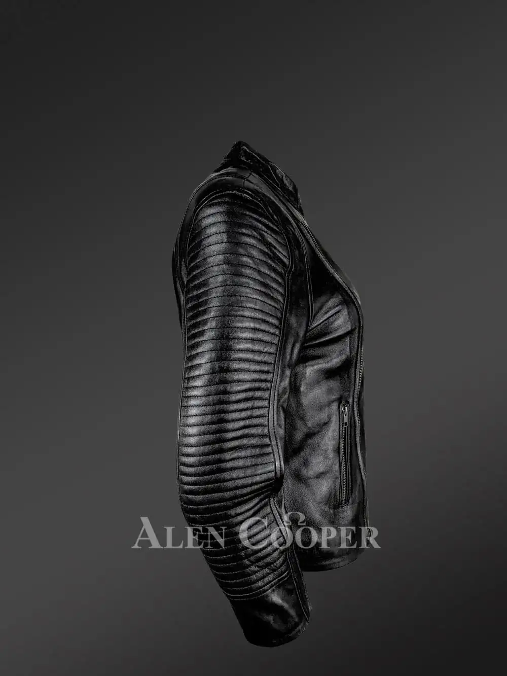 - Sleeves with ribbed leather quilting along the side and metal zipper at cuffs for snug fit and ease of use