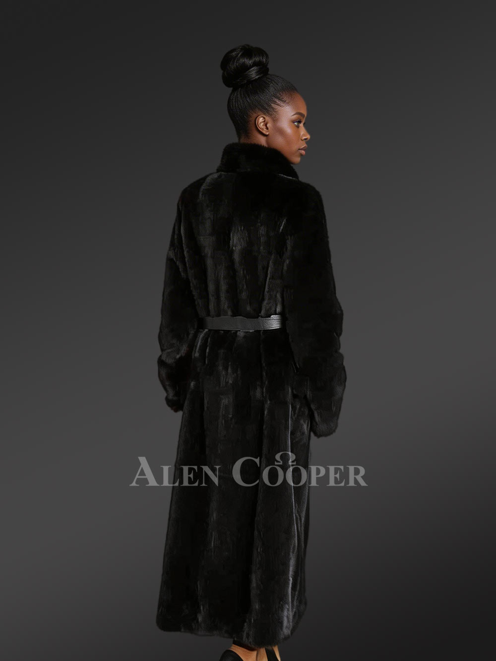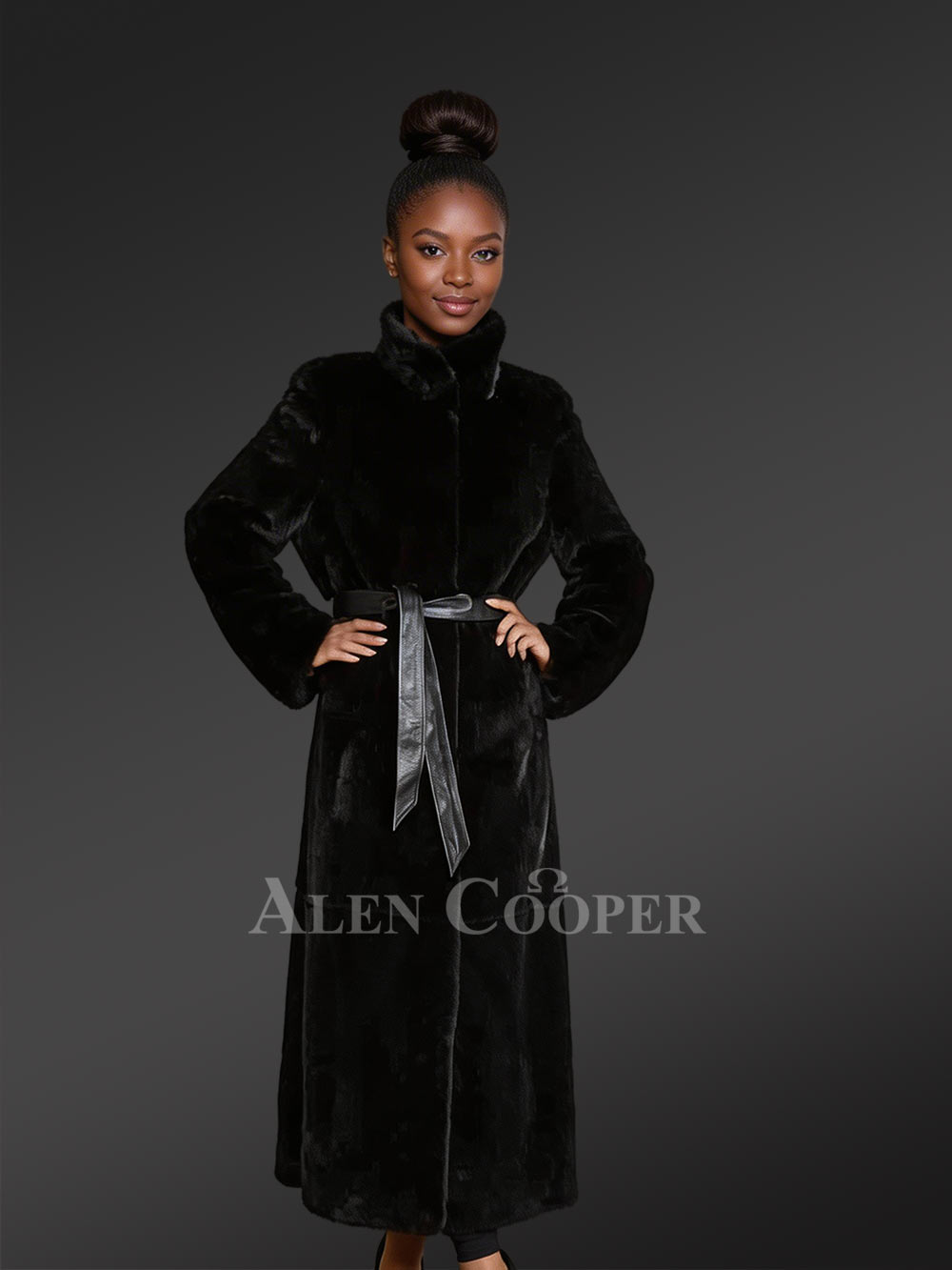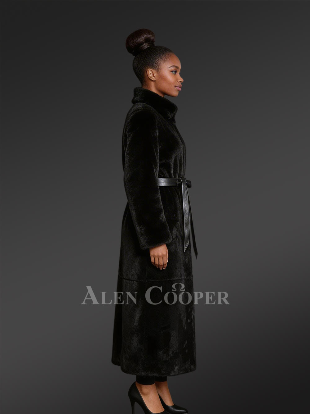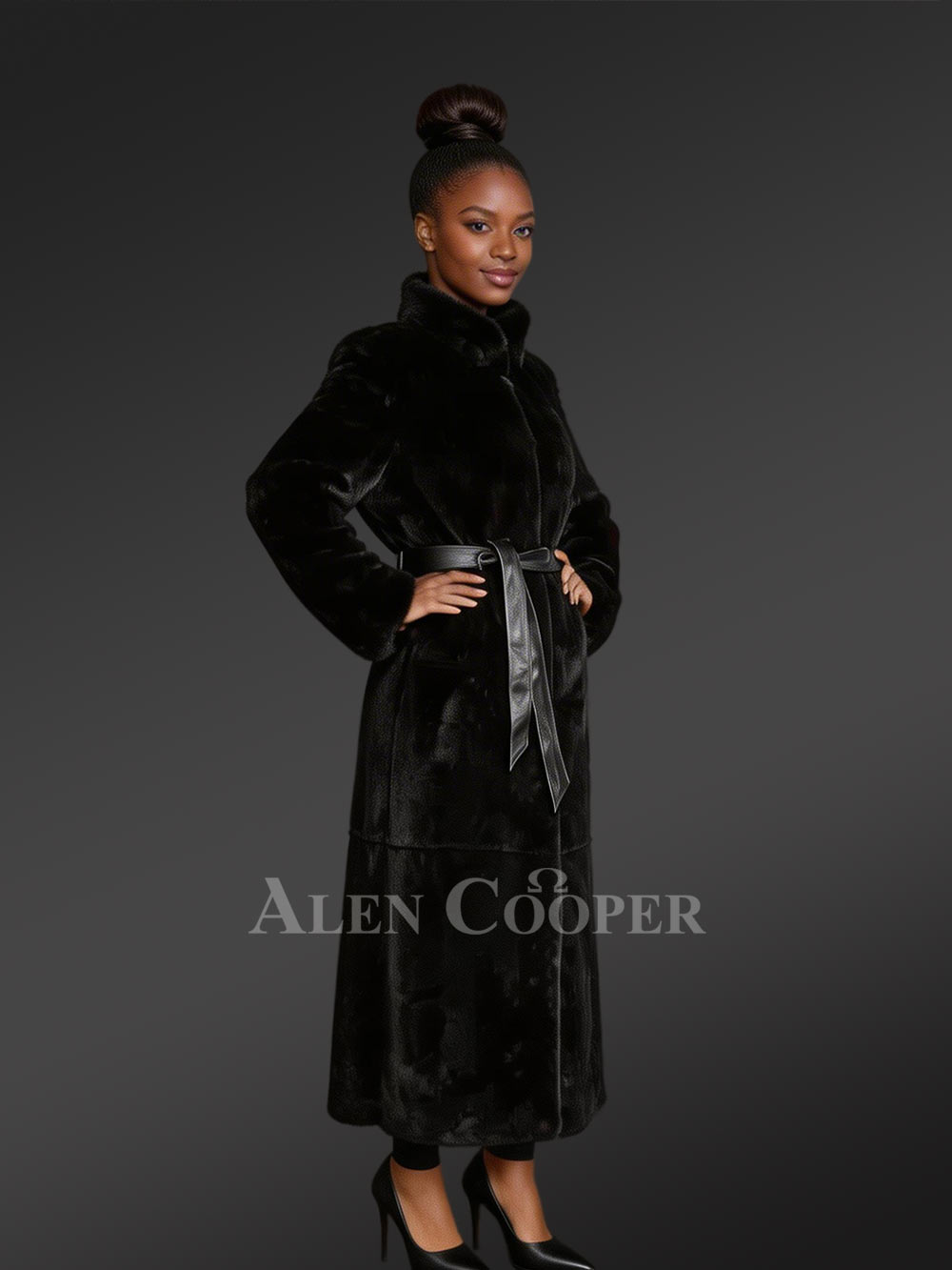Designers have handcrafted this long coat to perfection with attention to every detail starting from the selection of premium material to creating a perfect union between aesthetics and functionality. The design of this coat can make any woman look classy with a dynamic personality. At the same time, it offers all-round protection in colder months. The length of this coat touches the ankles. The long sleeves fit comfortably and cover the arms along with a part of the palms. The turtleneck collar embraces the neck in cozy warmth of mink fur with a plush feel.