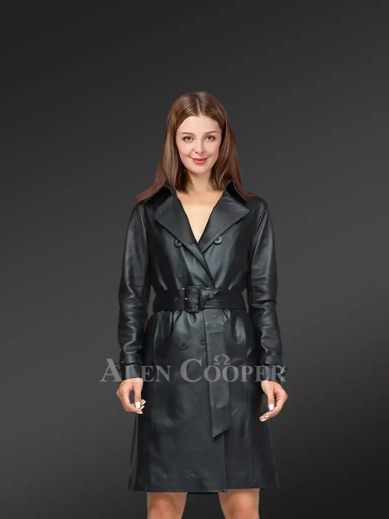 Black women’s trench coat displays a notched lapel collar design to accentuate its exclusive leather framework. It has a distinctive knee-length style with buttons distinctly exhibited on the front making it a modish double-breasted coat among other varieties. There is a stylized chunky leather belt at the waistline with a buckle imparting support to the entire attire making it easier to adjust according to body proportions. Even the sleeves of this elegant coat look distinguished and refined due to the distinct design of stylish buckled-up leather bands around the cuffs. This apparel has been exclusively designed taking into account all the essential attributes of a utilitarian trench coat.