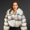 This women’s blue fox fur crop jacket is undeniably an exquisite winter statement piece. Designers have crafted it using premium pelts of Blue fox arranged in tiers. This designing style certainly creates a graceful silhouette. The body as well as the sleeves of this jacket features the same look.
