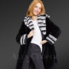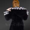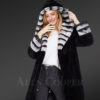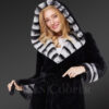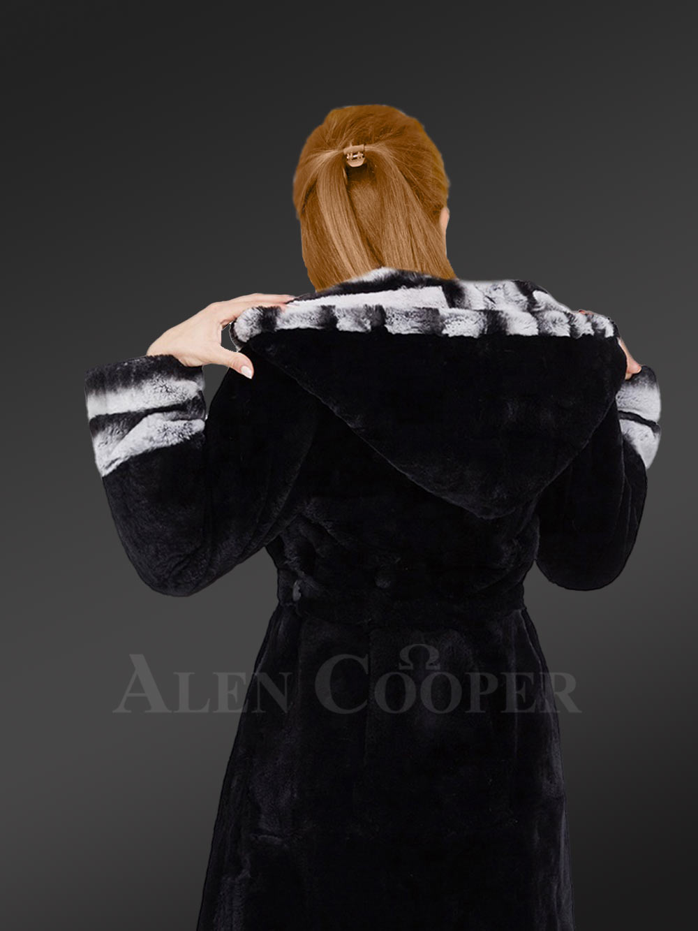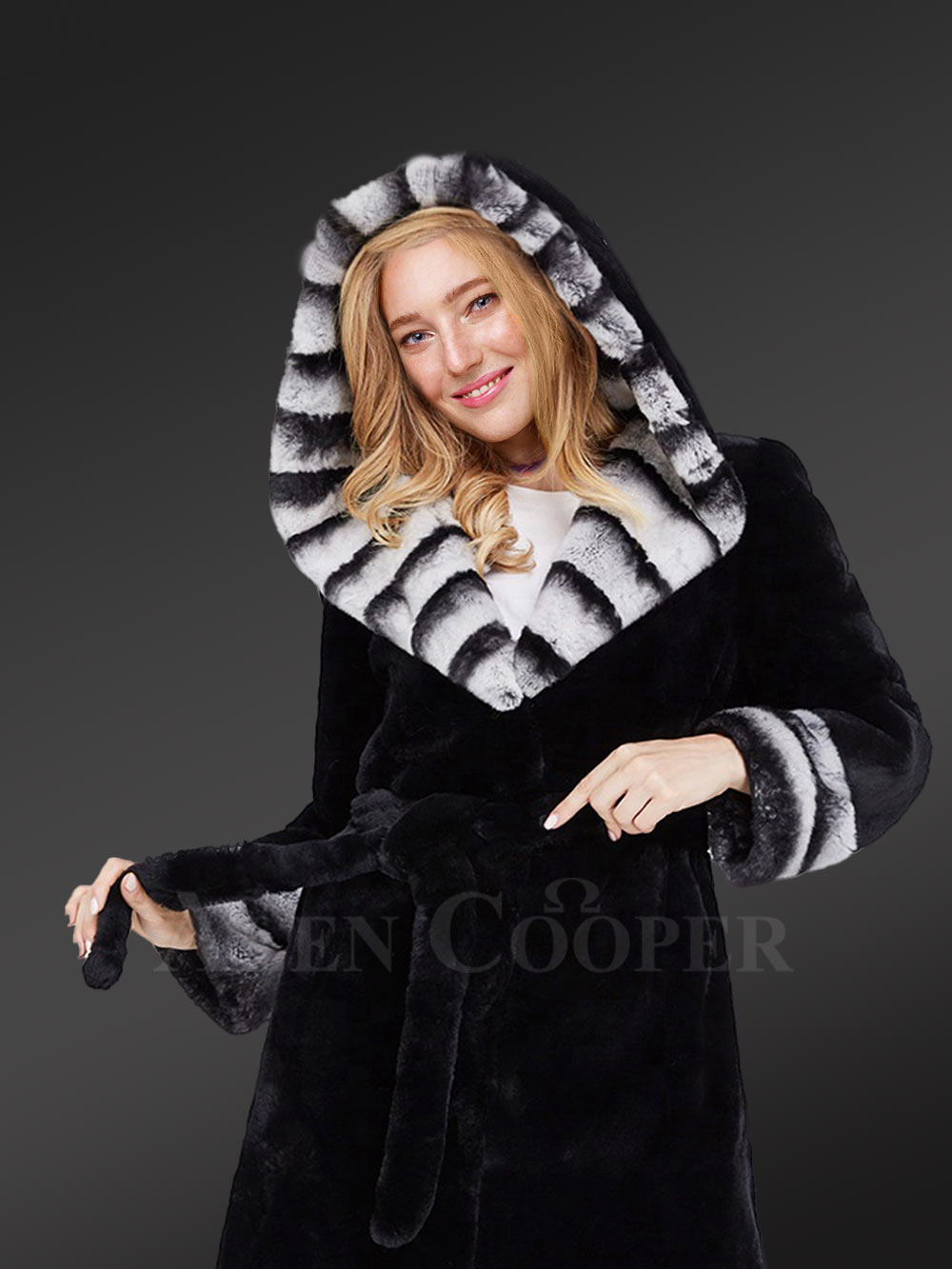 Additionally, it has a fixed hood with a drawstring closure, side pockets, and a zip-up front. Besides, the coat is sharply accentuated by Rex Rabbit Fur embellishments that are adorned across the hood border, sailor-style collar, and cuffs. Further, black and white, which contrast with one another, have a striking beauty that is reminiscent of chinchilla fur.