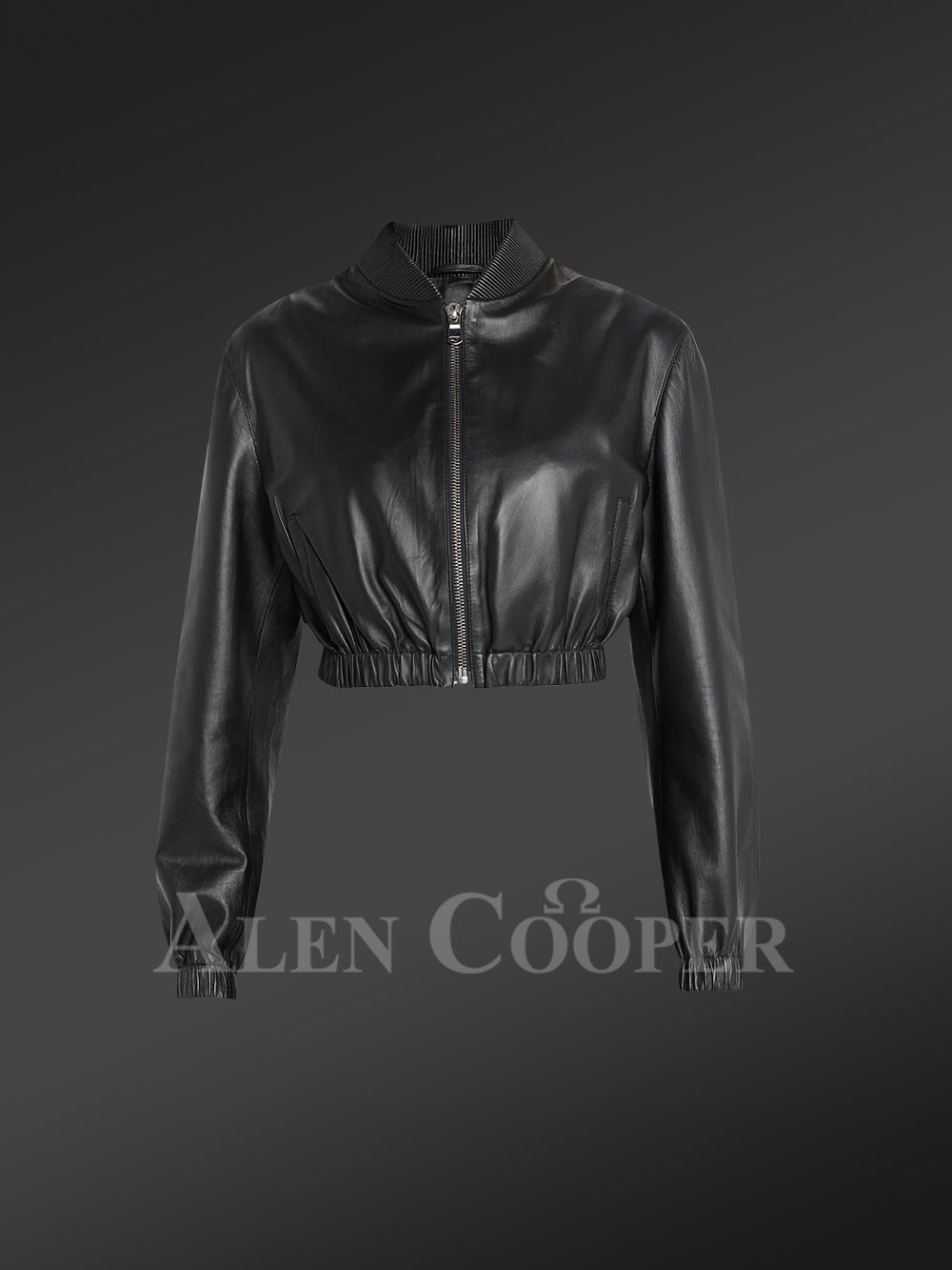 - Fashionable cropped length bomber jacket of sheepskin leather