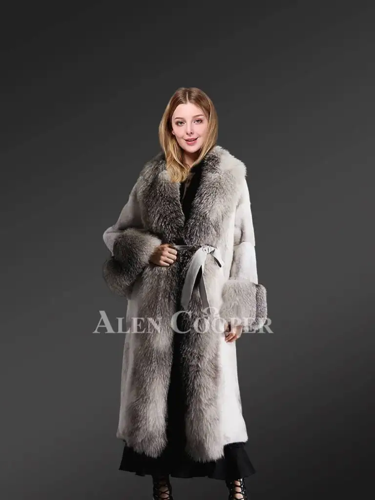 The appealing product range is crafted from authentic plates of genuine mink fur coats. The range of fur dressing merchandises is thoroughly crafted by hands. Made from high quality fur plates the coat has exceptionally soft and supple texture. The off white fur coat has a striking collar, frontline and handcuffs that are hard to ignore. These contrasting trims are made from 100% authentic plates of blue frost fox fur.