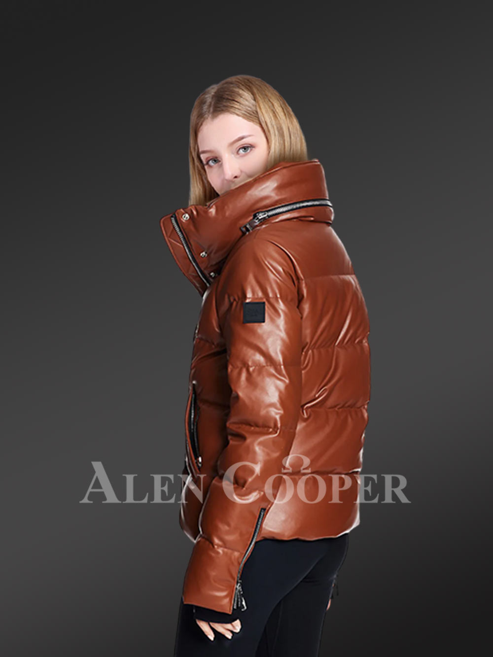 Pure lamb leather in a complete Aniline finish unveils its premium grade to exude the glossy-smooth texture and lustrous glow. Unparallel charm suffices the gorgeous wear. Down padding with fully 100% duck down is maintained. The comfy wear highlights its deluxe impression with the inner satin lining.