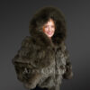 - Large hood of fox fur with a wide furry rim envelops the head and neck in comforting warmth