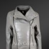 - Lambskin leather motorcycle jacket looks classy in light grey shade with zip fasteners on both sides