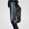 This posh womens hooded biker jacket looks spectacular in black. Furthermore, its classy design certainly revives the retro charm. It’s designed to make a woman look chic with the luxurious feel of lambskin leather. It has multiple pockets to carry one’s personal items with utmost safety. The front zipper of metal enables one to close this outfit up to the regular style collar. It also has a detachable hood to cover the head and neck in comforting warmth of the lambskin leather.