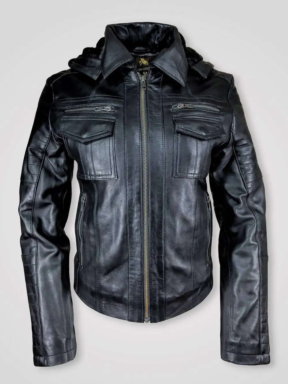 This posh womens hooded biker jacket looks spectacular in black. Furthermore, its classy design certainly revives the retro charm. It’s designed to make a woman look chic with the luxurious feel of lambskin leather. It has multiple pockets to carry one’s personal items with utmost safety. The front zipper of metal enables one to close this outfit up to the regular style collar. It also has a detachable hood to cover the head and neck in comforting warmth of the lambskin leather.