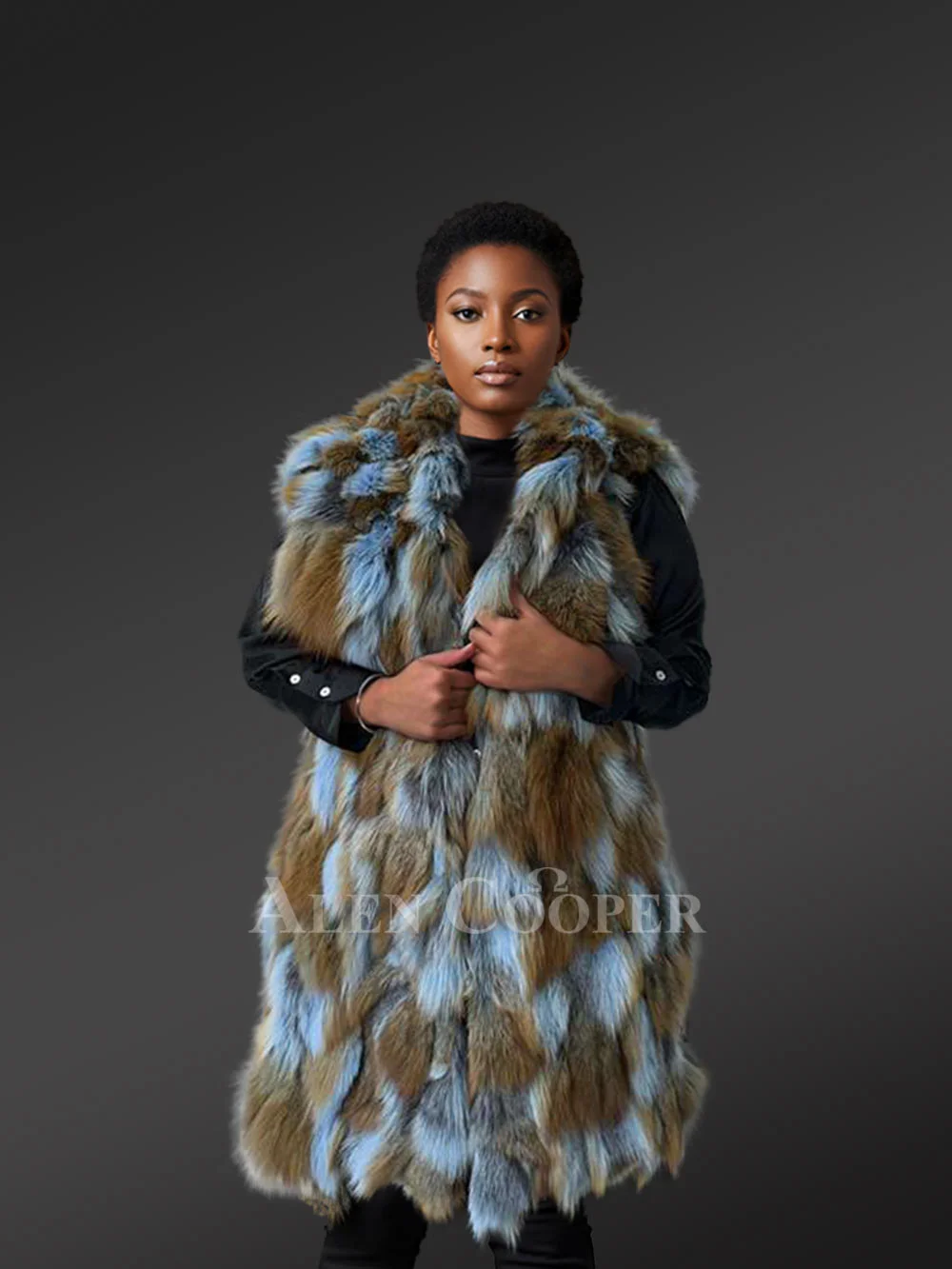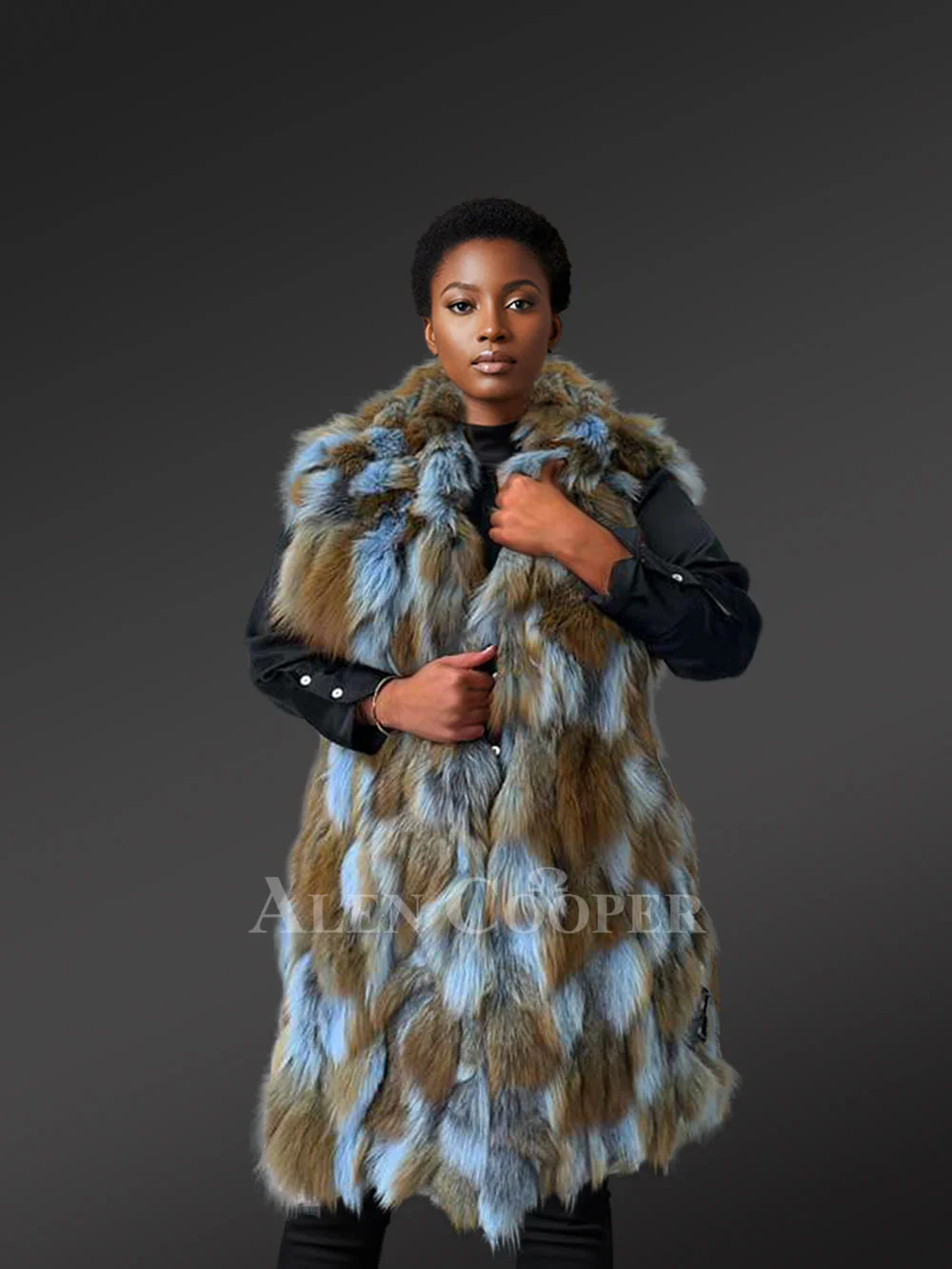This ultra-luxefox fur vest looks fascinating in blue and tan shades and brings timeless glamour to any winter wardrobe. It’s a testament to exceptional craftsmanship. Designers have crafted it using high-end materials to ensure comfort, sleek aesthetics as well as durability. The use of sectioned pelts certainly creates a sculpted visual owing to the paneled design which lends this vest a distinctive allure. Furthermore, it brings the unparalleled warmth and comfort of premium fox fur.