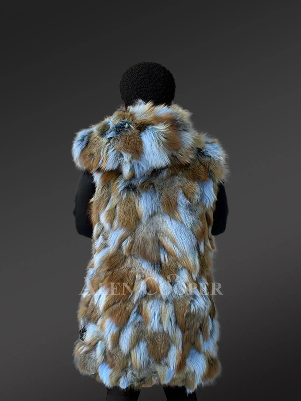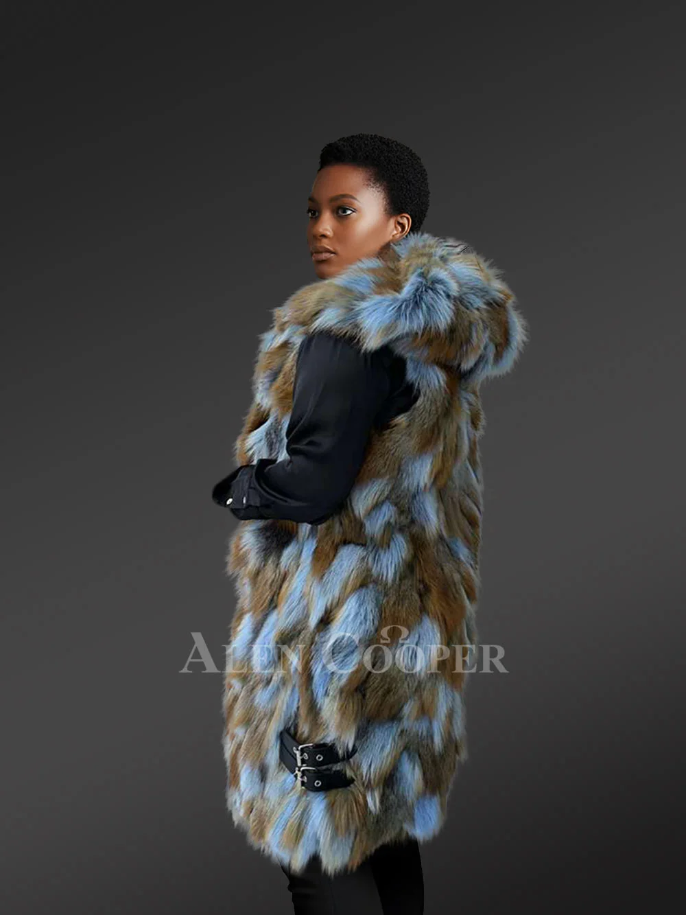 This luxurious knee-length womenshooded fox fur vest showcases the artfully arranged sectioned pelts in a lovely blend of blue and tan shades. This certainly creates a striking visual appeal. This elegant vest features a smooth silk lining which glides effortlessly over any outfit. It has side pockets for convenience and discreet hook-and-eye fasteners ensuring a seamless front. This fur vest also features a pair of buckled leather straps near the hemline to adjust the fit based upon one’s personal preference. It’s perfect for both casual affairs and celebrations or gala events.