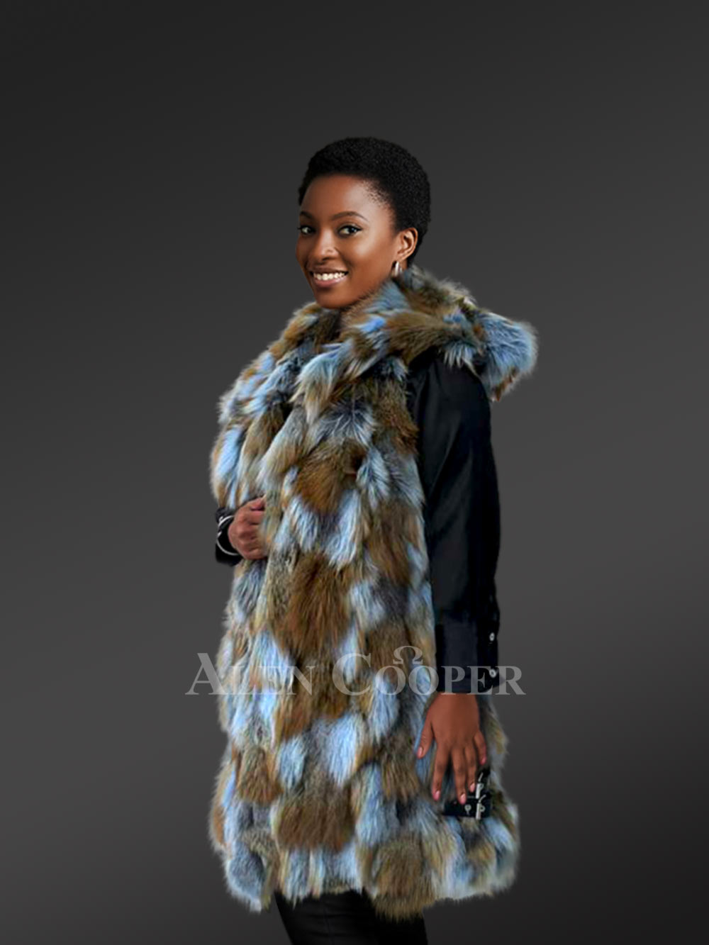 Notable Features of Womens Hooded Vest of Fox Fur in Blue & Tan